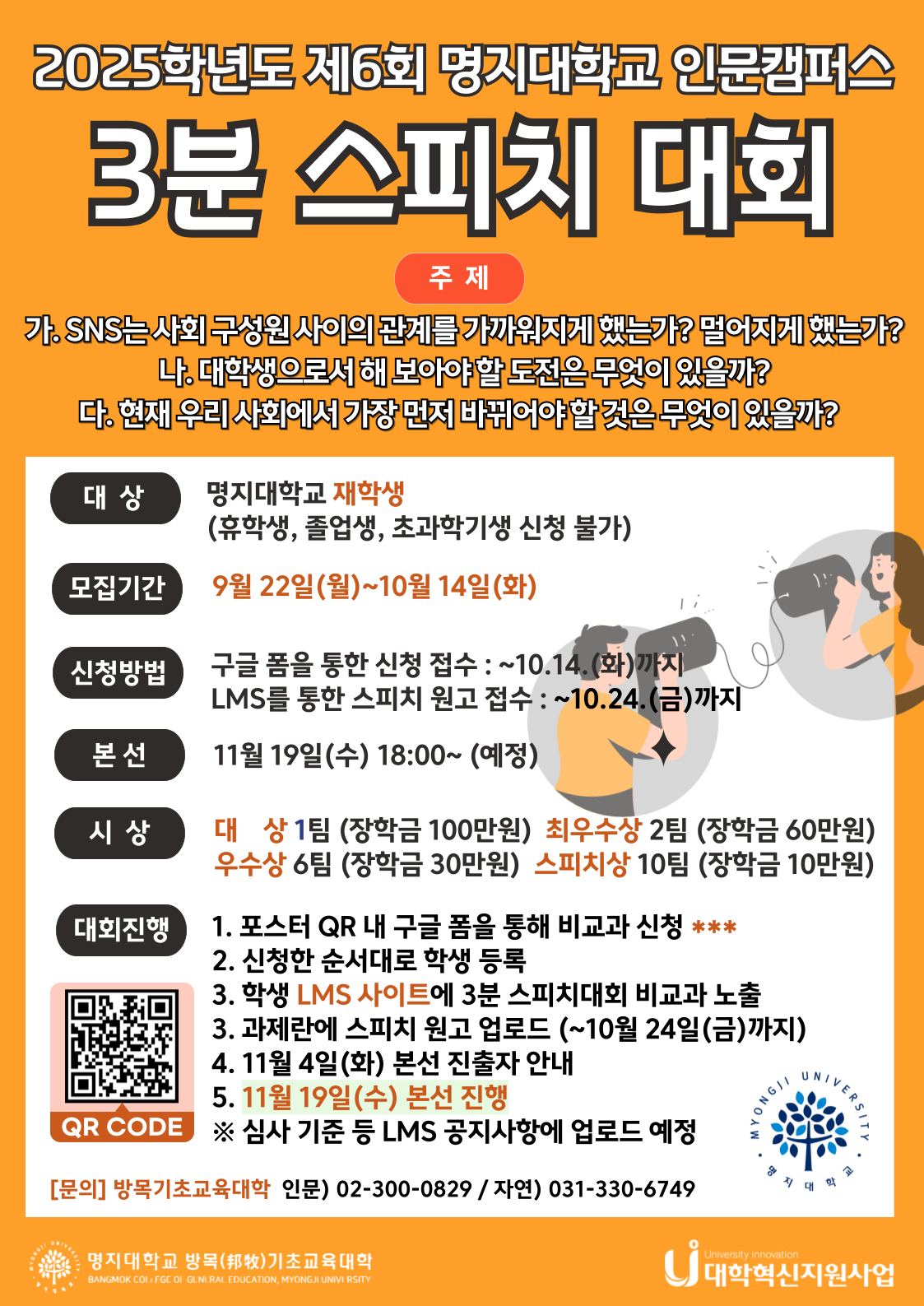 🗣 2025학년도 제6회 명지대학교 인문캠퍼스 3분 스피치 대회 신청 안내